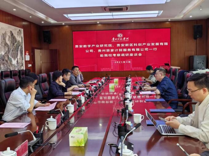 2025年4月29日,贵安数字产业研究院院长、贵安新区科创产业发展有限公司常务副总经理邓周灰一行八人赴贵州师范学院就校企深度合作事宜开展调研交流。调研交流座谈会在信息楼二楼会议室举行,学校校长韦维出席座谈会,教务处、教育信息网络中心、贵州省纳米材料与模拟计算重点实验室、商学院、数学与大数据学院、物理与电子科学学院、美术与设计学院等部门和学院负责人参以及贵安数字产业研究院副院长邓云波、战略委员会副主任穆俊、产业金融创新中心主任钟魏然、AI应用创新中心主任李镭,贵州算家计算服务有限公司总经理杨家维、总工程师仝天乐,贵安新区科创产业发展有限公司技术研发部项目经理刘廷娟等加座谈会,座谈会由学校教务处处长杜宏博主持。